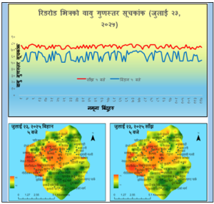 जुलाई महिनामा धेरै पानी पर्ने भएकाले सामान्यतया काठमाडौंको वायु गुणस्तर सूचकांक स्थर कम नै हुने गर्दछ। यद्यपि, यस लेख लेख्ने क्रममा सन् २०२५ को जुलाई महिनाको २३ तारिख बिहान ५ बजे र सोही दिन बेलुकी ५ बजे (सबैभन्दा कम सवारी चल्ने समय बिहान ५ बजे र सबैभन्दा बढी सवारी चल्ने समय बेलुकी ५ बजे) को छुट्टाछुट्टै जम्मा १२५ वटा नमुना बिन्दुहरूको रियल टायम डाटा, सेटलाइटबाट तानेर छोटो विवेचना गर्ने प्रयास गरिएको छ।