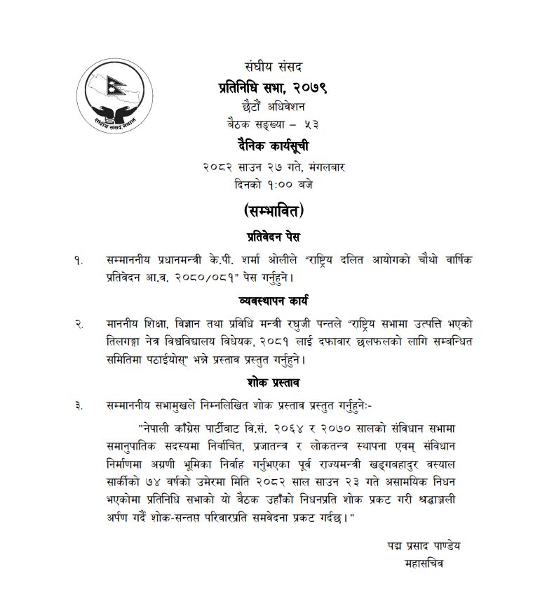 साथै, २०६४ र २०७० संबिधानसभा समानुपातिका सांसद तथा पुर्व राज्यमन्त्री खडगबहादुर बस्यालको निधनमा शोक प्रस्ताव पारित गरिनेछ ।