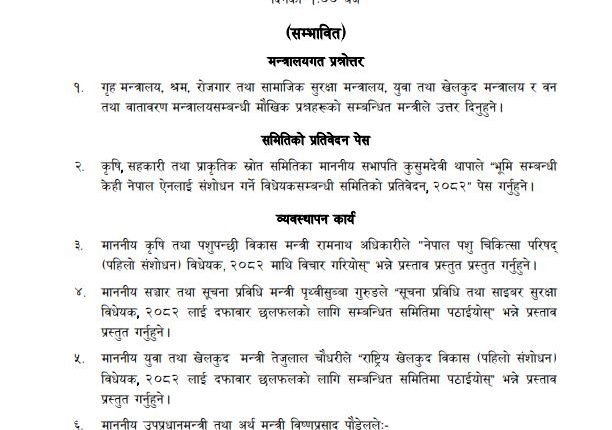 आजको बैठकमा गृह, श्रम, खेलकुद र बन मन्त्रालयसँग सबन्धित प्रश्नको सबन्धित मन्त्रीहरूले उत्तर दिनेछन् भने कृषी, सहकारी, प्राकृतिक स्रोत समितिको सभापति कुसुमदेवी थापाले ‘भुमी सबन्धी केही नेपाल एेनलाई संसोधन गर्ने बिधेयक सबन्धी समितिको प्रतिवेदन, २०८२ पेश गर्नेछिन् ।