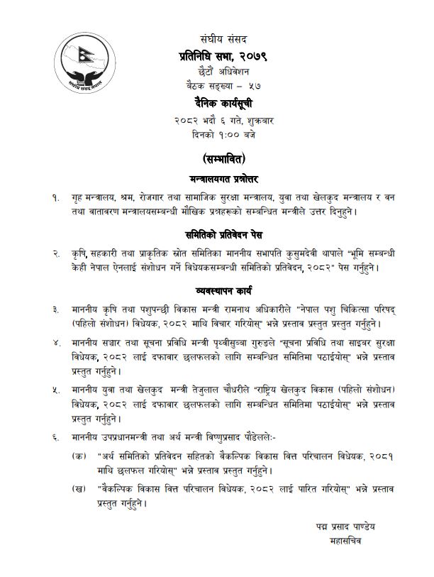 कृषी तथा पशुपन्छी मन्त्री रामनाथ अधिकारीले ‘नेपाल पशु चिकित्सक परिषद (पहिलो संसोधन) बिधेयक, २०८२ माथी बिचार गरियोस् भन्ने प्रस्ताव प्रस्तुत गर्नेछन भने सञ्चार तथा सुचना प्रबिधि मन्त्री पृथ्वी सुब्बा गुरूङले ‘सुचना प्रबिधि तथा साइबर सुरक्षा बिधेयक, २०८२ लाई दफावार छलफलका लागि सबन्धित समितिमा पठाइयोस्’ भन्ने प्रस्ताव प्रस्तुत गर्नेछन् ।