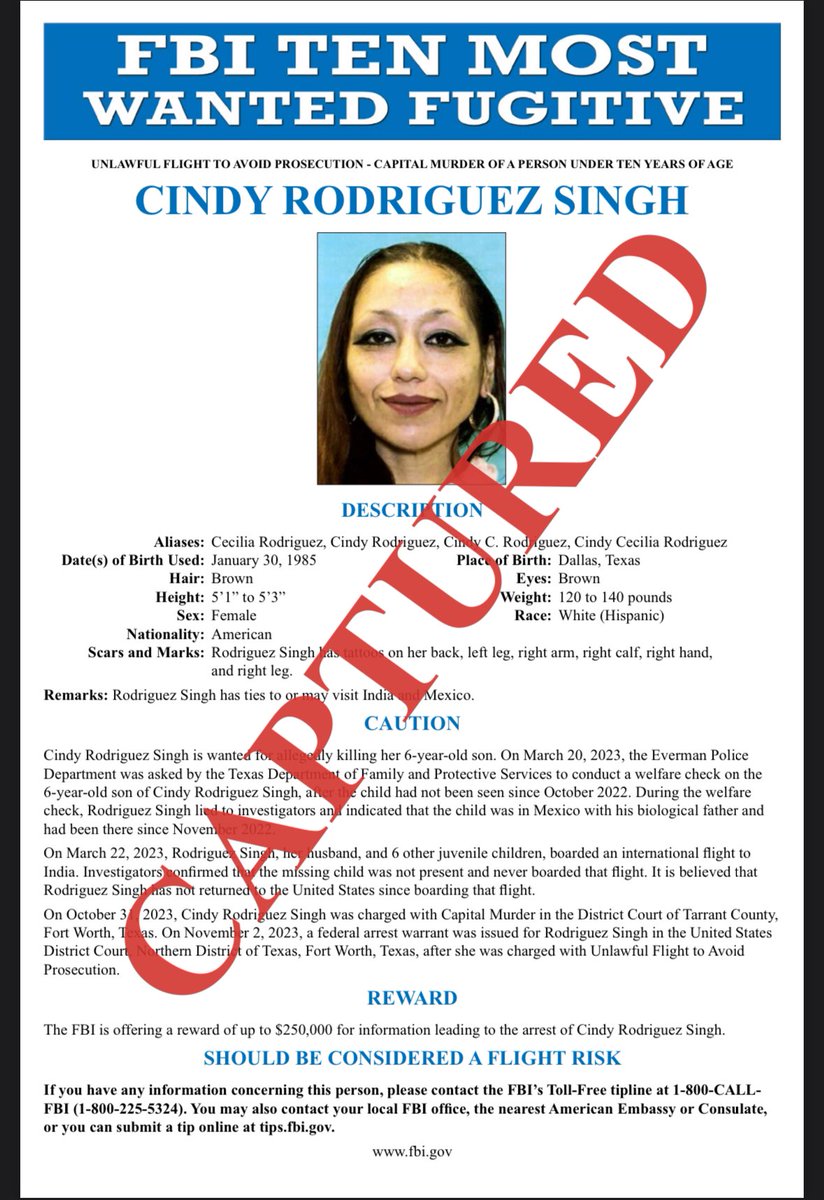 टेक्सासका अधिकारीहरूले नोभेम्बर २०२३ मा उनको विरुद्ध पक्राउ वारेन्ट जारी गरेका थिए। एफबीआईले जुलाई २०२५ मा सिन्डीलाई आफ्नो मोस्ट वान्टेड सूचीमा समावेश गरेको थियो।