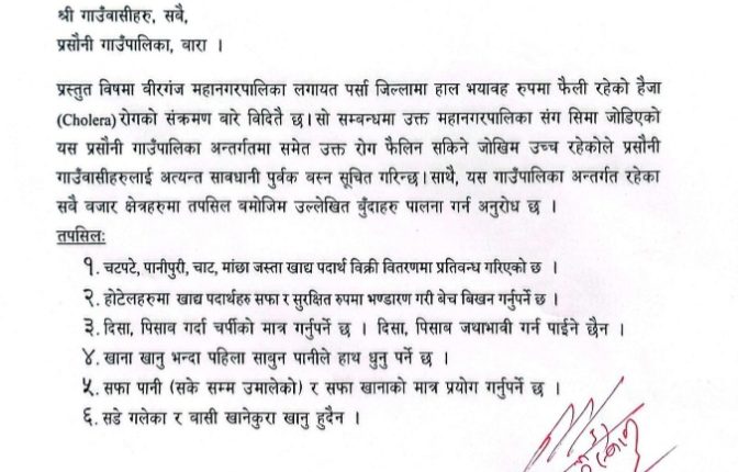 कलैया, ०८ भदौ। वीरगञ्जमा हैजाका बिरामी फेला परेपछि सँगै जोडिएको बाराको प्रसौनी गाउँपालिकाले समेत सार्वजनिक सूचना जारी गर्दै स्वास्थ्य सुरक्षाका लागि तत्काल सतर्कता अपनाउन स्थानीयवासीलाई आग्रह गरेको छ।