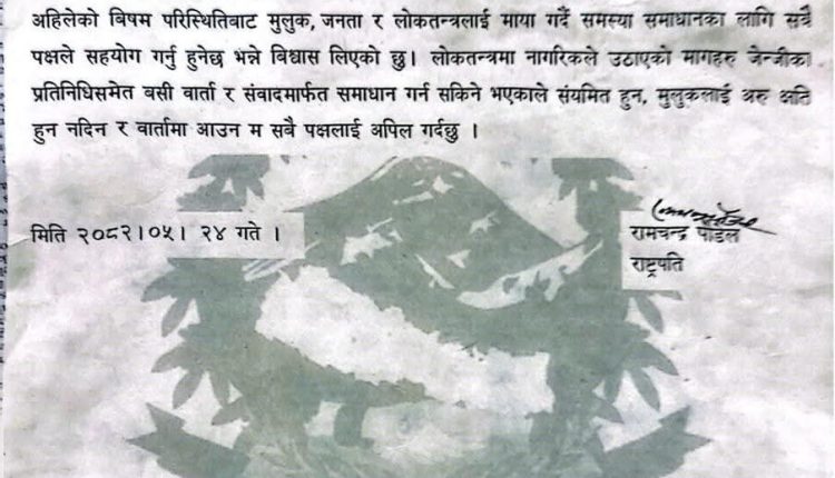 राष्ट्रपति पौडेलकी स्वकीय सचिव अवज्ञा पौडेलले मंगलबार एक विज्ञप्ति जारी गर्दै आन्दोलनरत पक्षलाई वार्तामा सहभागी हुन आह्वान गरेको जानकारी दिइन्।