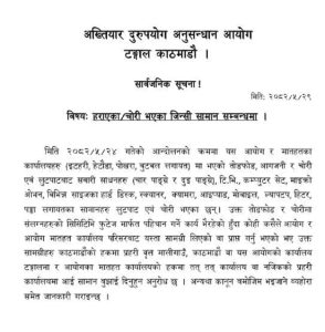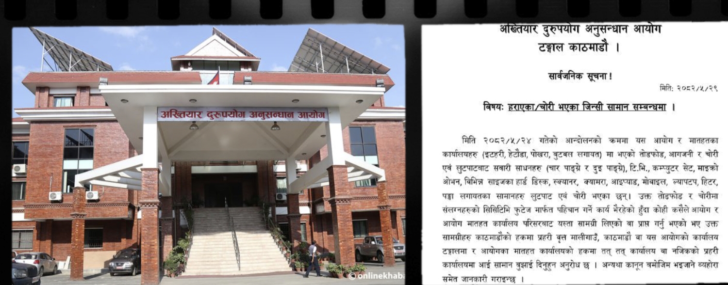 काठमाण्डौ : अख्तियार दुरूपयोग अनुसन्धान आयोगले विभिन्न कार्यालयमा तोडफोड र आगजनीपछि लुटपाट भएका सामान फिर्ता गर्न आग्रह गरेको छ।