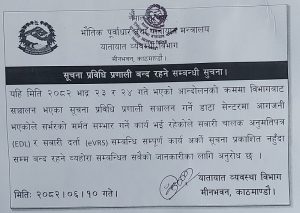 विभागले शुक्रबार एक सूचना जारी गर्दै भदौ २३ र २४ गतेको आन्दोलनका क्रममा मीनभवनस्थित डाटा सेन्टरमा आगजनी भएको कारण प्रणाली सञ्चालनमा समस्या आएको जनाएको छ। उक्त घटनापछि सर्भर मर्मत कार्य जारी रहेको बताउँदै विभागले अर्को सूचना नआउन्जेलसम्मका लागि सेवाहरू उपलब्ध नहुने स्पष्ट पारेको छ।