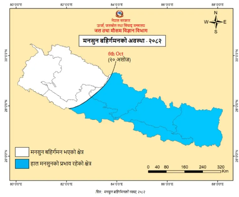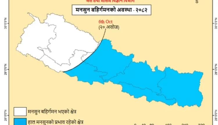 जल तथा मौसम विज्ञान विभागका अनुसार यही असोज २० गते पश्चिमबाट बाहिरिन सुरु गरेको मनसुन आज देशभरबाट बहिर्गमन भएको हो।