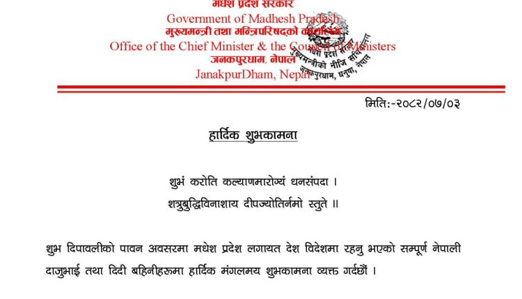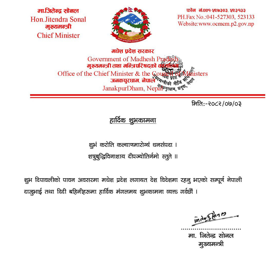जनकपुर। मधेश प्रदेशका मुख्यमन्त्री जितेन्द्र सोनलले तिहार तथा दीपावलीको पावन अवसरमा शुभकामना सन्देश जारी गरेका छन ।