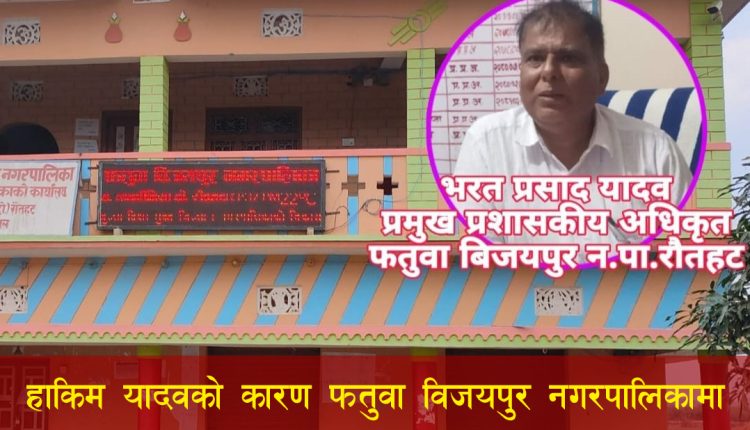 फतुवा विजयपुर नगरपालिकामा पछिल्ला महिनाहरूमा प्रशासनिक र सेवाप्रवाहका क्षेत्रमा उल्लेखनीय सुधार देखिएको छ। नगरपालिकामा कार्यरत प्रमुख प्रशासकीय अधिकृत हाकिम यादवको नेतृत्व, सक्रियता र कार्यशैलीका कारण जनस्तरमा सुधारको अनुभूति भएको स्थानीयवासीहरूले बताएका छन्।
